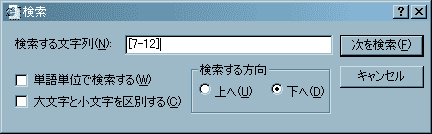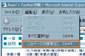 +CG入手場所検索方法+ 攻略のページでCGに[2-3]のように番号をつけて入手場所を書いてあるものでは ブラウザの『ページ内検索』を使って探すことができます [7-12]の入手場所を探したい場合 (IE、NN共通) 編集から「このページの検索」を選択 ![]() 下のような小窓が開くので[7-12]と半角文字[ ]付きで入力して検索してください。 [ ]はつけなくても構いませんが、例えば1-1と入力すると1-12や11-1等も検索対象となるので 目標の番号のみヒットさせるなら[ ]を付けることをお勧めします。 ![]() ページ頭から下に向かって検索するのが確実な方法です フレームページでは内容が書いてある方を検索するようにしてください |