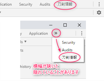 デベロッパーツールパネルに『刀剣情報』が追加されているので選択