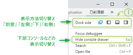 デベロッパーツールウインドウ右上のボタンをクリックしてメニューを表示