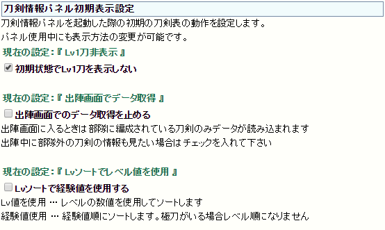 主にパネルを開いた時の『刀剣表』の初期設定、後からパネル側で切り替え可能です。・Lv1刀の初期表示のON/OFF
