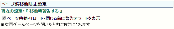 ゲームページの『誤移動防止アラート』のON/OFF誤ってページを閉じたり別ページへ移動してしまう事故防止用