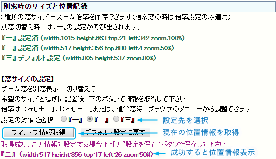 ツール『ポップアップ窓(別窓)』時の位置とサイズを3種類保存できます1.別窓の状態で希望の位置とサイズ、倍率でゲーム窓を配置